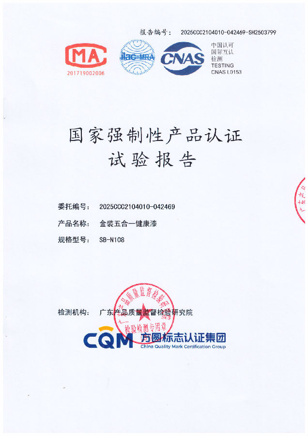 装修选墙漆,颜值与健康如何兼得?当刺鼻气味成为居家隐患,当有害物质暗藏健康风险,睡宝涂料金装五合一健康漆用权威认证给出答案——在国家强制性产品认证试验中,所有指标均达到合格标准,让墙面装饰不止于美观,更成为家庭健康的第一道防线。